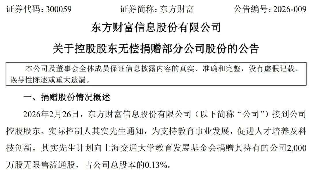 2月26日盘后,东方财富信息股份有限公司(东方财富,300059.SH)发布公告称,公司接到控股股东、实际控制人其实先生通知,为支持教育事业发展,促进人才培养及科技创新,其实先生计划向上海交通大学教育发展基金会捐赠其持有的公司2000万股无限售流通股,占公司总股本的0.13%。