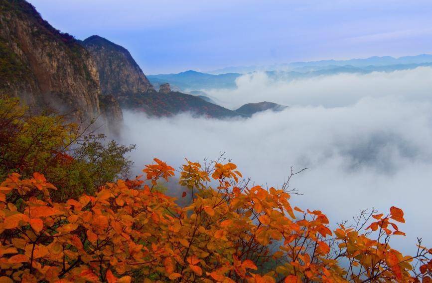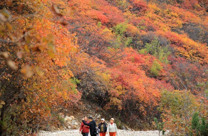游客在武安市东太行百里画廊贺进镇三门扇红叶观赏地游览。刘学维摄