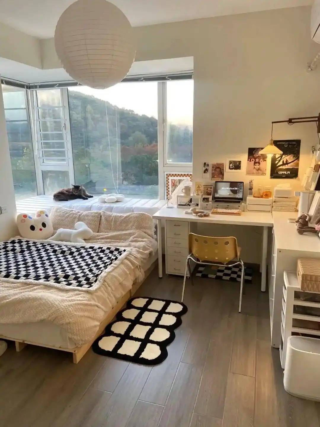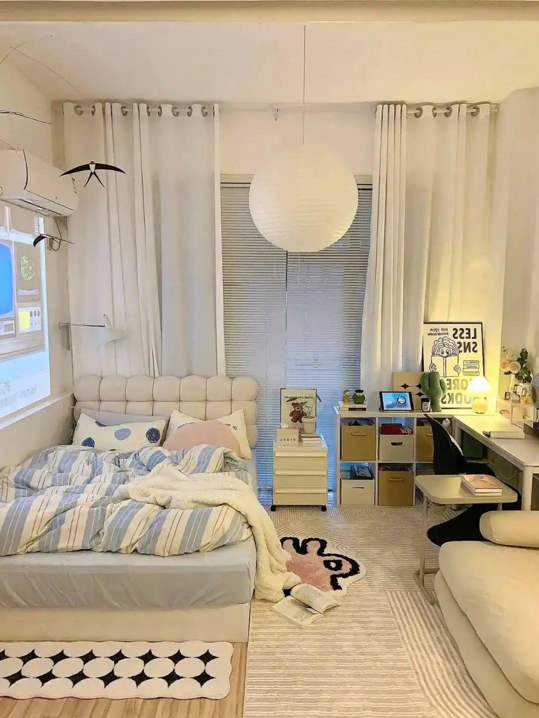 第四款是「清新韩系房」!蓝白条纹床品+大白球吊灯,收纳柜和书桌一体,还有可爱的卡通地毯,阳光透过百叶窗洒进来,干净又治愈,打工人住进去,所有疲惫都烟消云散!