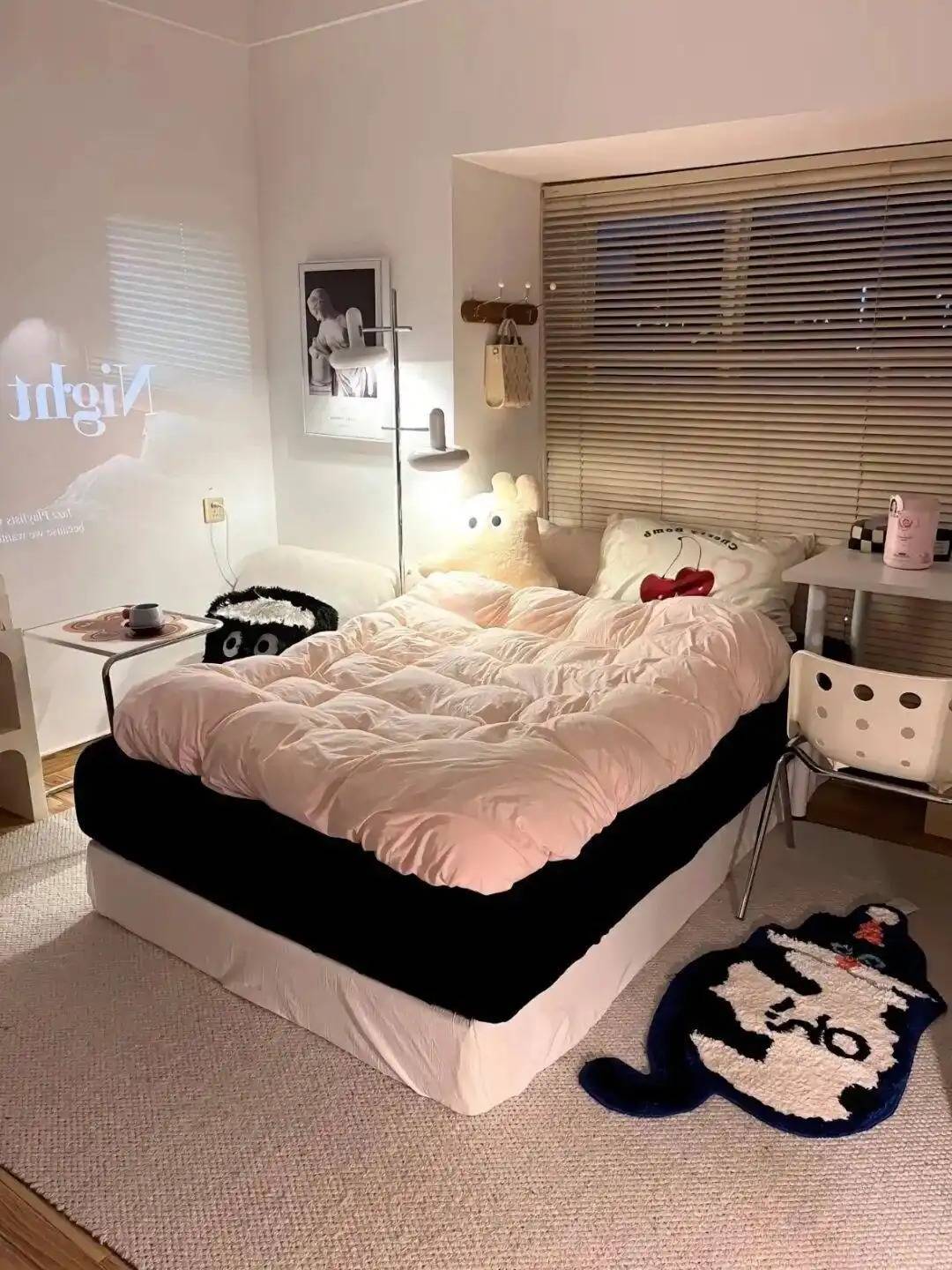 第二款是「甜酷少女房」!粉白床品+黑色床架,投影一打开氛围感直接拉满,还有小怪兽地毯和樱桃抱枕,晚上窝在这里看电影,谁还会出门啊!