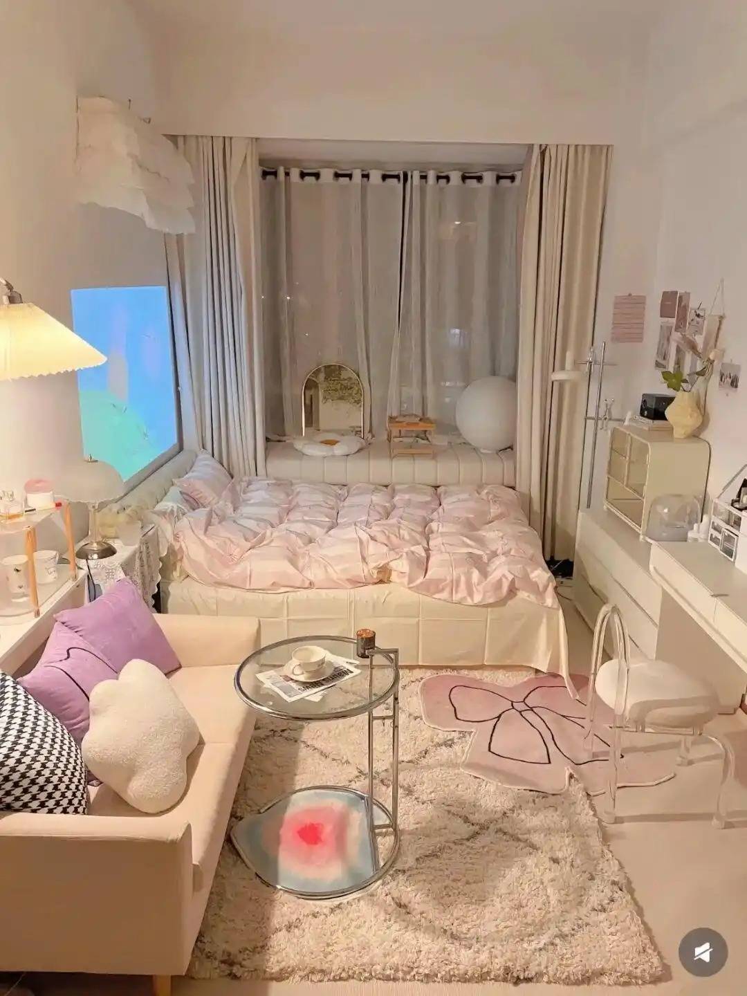 第三款「公主风小窝」直接戳中少女心!粉色条纹床品+蕾丝纱帘,还有地毯和小沙发,阳光洒进来,整个房间都软fufu的,感觉在这里睡一觉,连梦都是甜的!