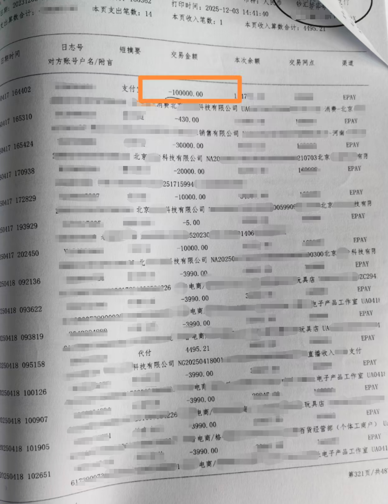 朱先生提供的银行流水显示,2024年7月之前,小梦若干次消费,单笔数额在数十元到千元之间。7月17日开始,频繁出现单日数十次的高频率消费。其中,7月24日消费33笔,累计37278元;25日消费32笔,累计23265元;26日消费37笔,累计24117元。 截至2025年11月底,小梦基本维持着这样的频率和数额。朱先生称,小梦在某团播直播间打赏金额最多,特别是给团成员“江某某”“狐狐某某”的打赏。