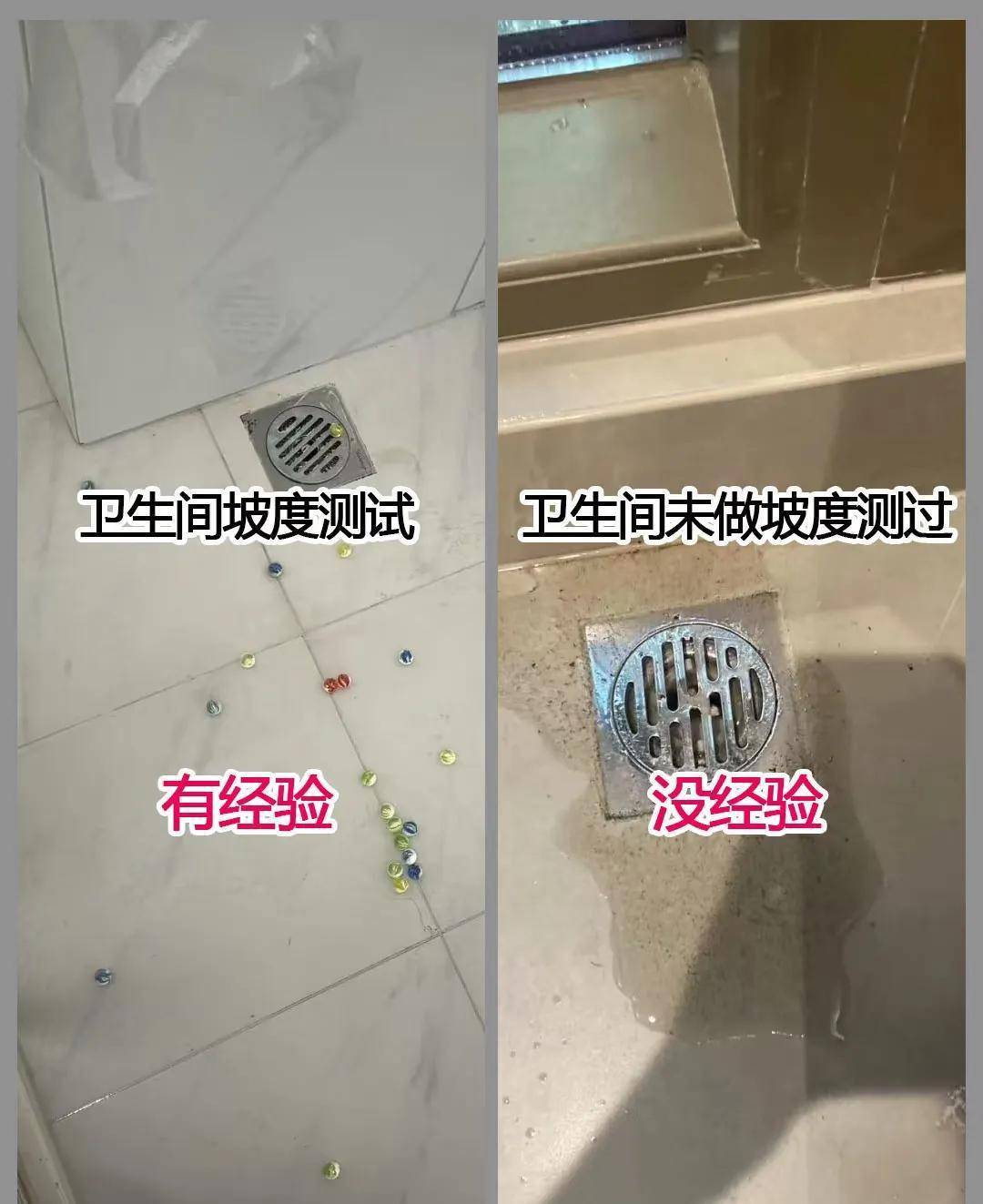 ✔️ 有经验:放水/放球测试,水都往地漏跑,绝不积水。
