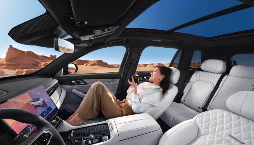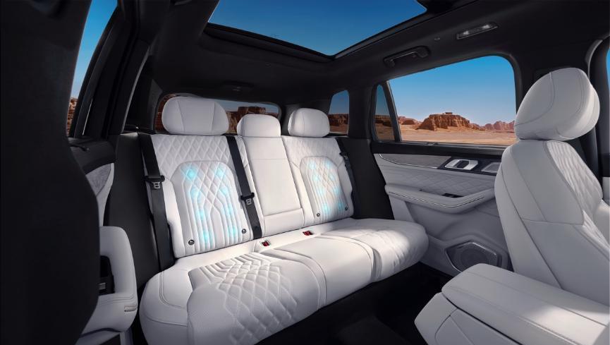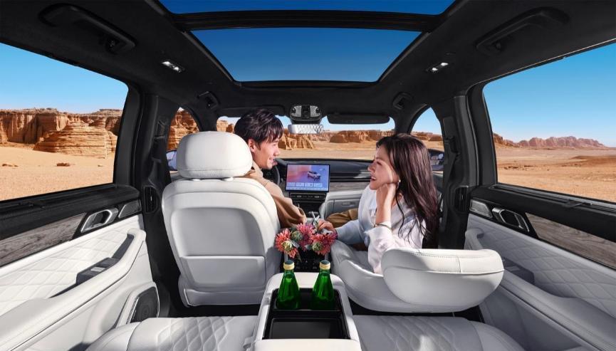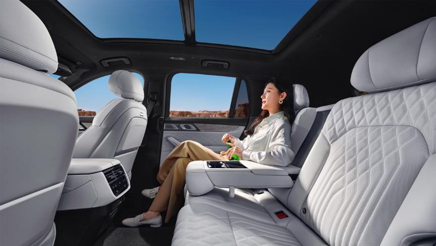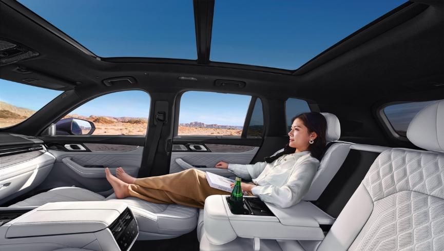 二排新增多功能中央扶手,放倒秒变商务四座行政座舱;二排小桌板,既是长途自驾的阅读桌和移动餐吧,又是商务出行的移动工作台。全车Nappa真皮覆盖,三档加热、通风和8点式背部按摩由前排独享进阶为四座同享,带来二排舒压放松的平权,搭配双层静音隐私玻璃和遮阳帘,能有效防晒、保护隐私;同时,副驾还新增280mm一体式4向电动腿托,可一键开启女王专享,舒适躺姿堪比航司头等舱。